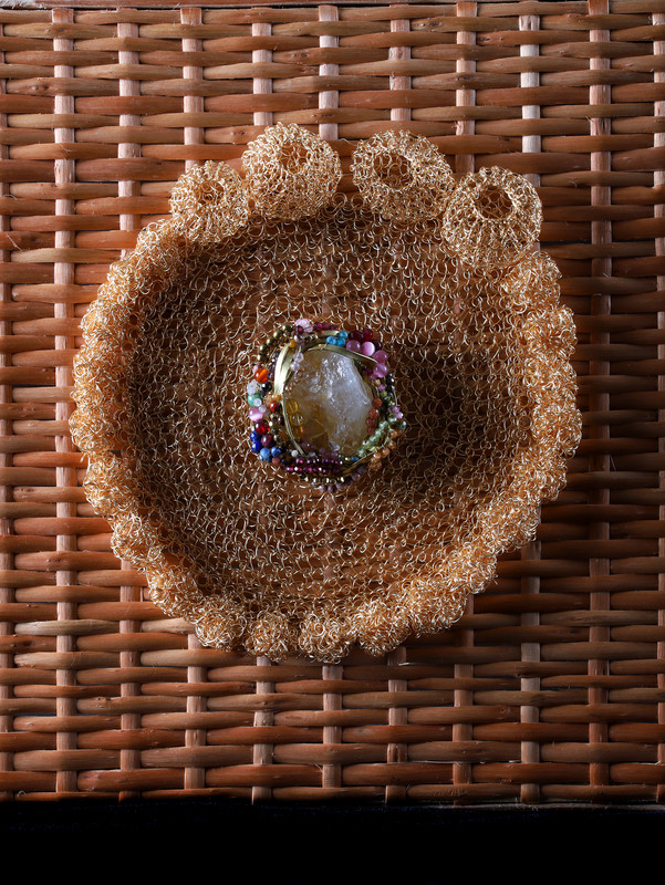 Capazo hecho a mano de mimbre natural, con cobre. Centro del amuleto tiene una piedra citrino y en su alrededor hay cuarzo rosado, granate, lapislázuli, coral naranjo y coral rojo, cuarzo cristal blanco, turquesa, pirita, citrino, piedra del sol, raíz de rubí, cornalina, rodocrosita, turmalina de varios colores y peridoto.