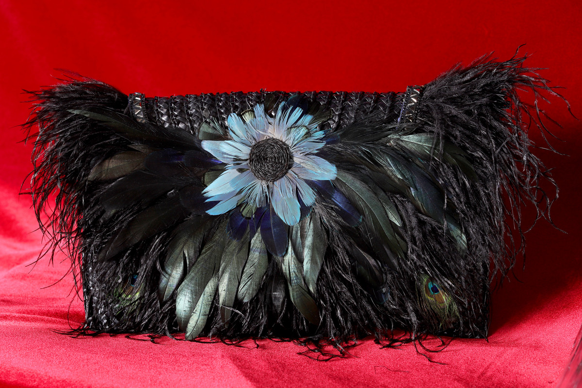 Capazo tejido a mano, confeccionado con paja natural y teñido en negro. Se puede utilizar en el hombro o en la mano. Tiene una cadena dorada metálica. Las plumas de avestruz son recolectadas en la época de cambio de plumaje de las aves, de acuerdo a nuestra filosofía de moda sustentable.