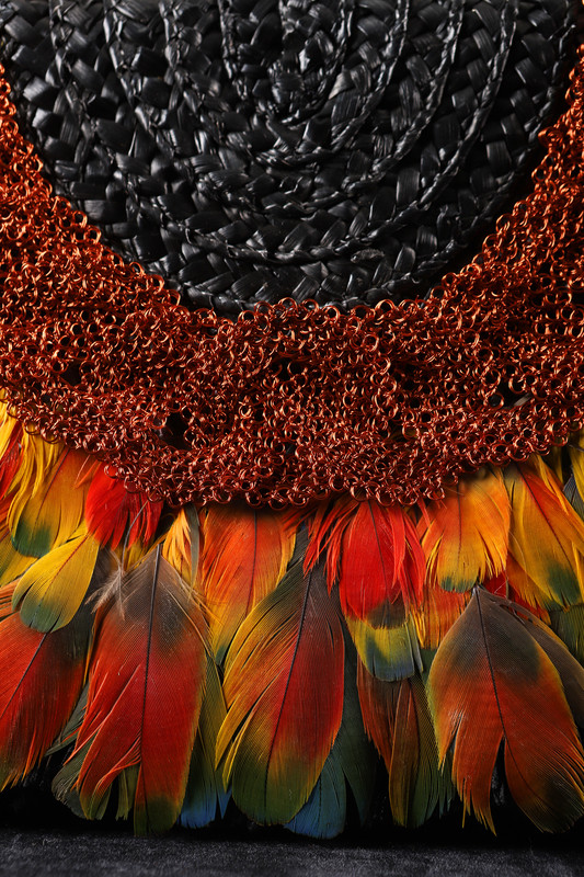 Capazo de paja hecho a mano, una cadena metálica que se puede usar de hombro como de mano, plumas de papagayos, una cadena tejida totalmente a mano punto peruano en cobre