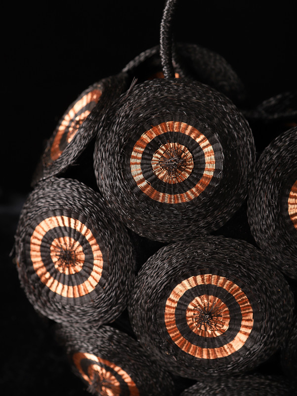 Este capazo me inspiró a incorporar la técnica de la rosa de crin, un tejido tradicional de Rari. Mi objetivo era fusionar la rica tradición ancestral con un toque moderno, centrándome en el tejido y trenzado de crin, y luego agregarle el elemento del cobre. Así, el diseño final consta de tres elementos que se entrelazan de manera armoniosa. Esta creación fue obra de la talentosa artesana, mi amiga Flor, quien supo plasmar esta visión en la pieza con maestría.