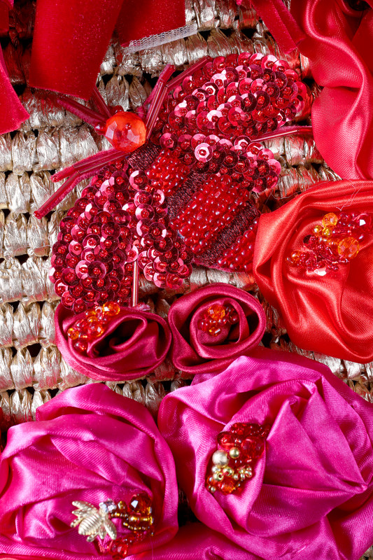 Capazo de paja flexible tejido a mano, con flores de raso de seda hechas pétalo por pétalo, bordadas con lentejuelas, mostacillas y perlas. Abejorros bordados con hilo de seda. Asas intervenidas con lentejuelas de color rojo oscuro.