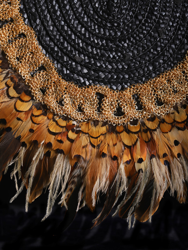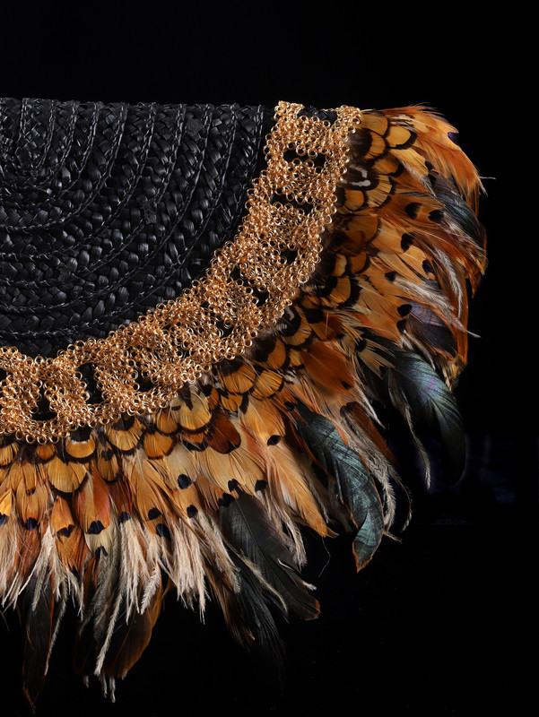 Hecho a mano con paja, este clutch se lleva en mano o al hombro, complementado con una cadena metálica dorada y otra de eslabones de cobre, tejida con técnicas innovadoras. Incorpora plumas de faisán dorado, plumas color crema de avestruz y variados tonos de plumas de gallo, fusionando arte y moda.