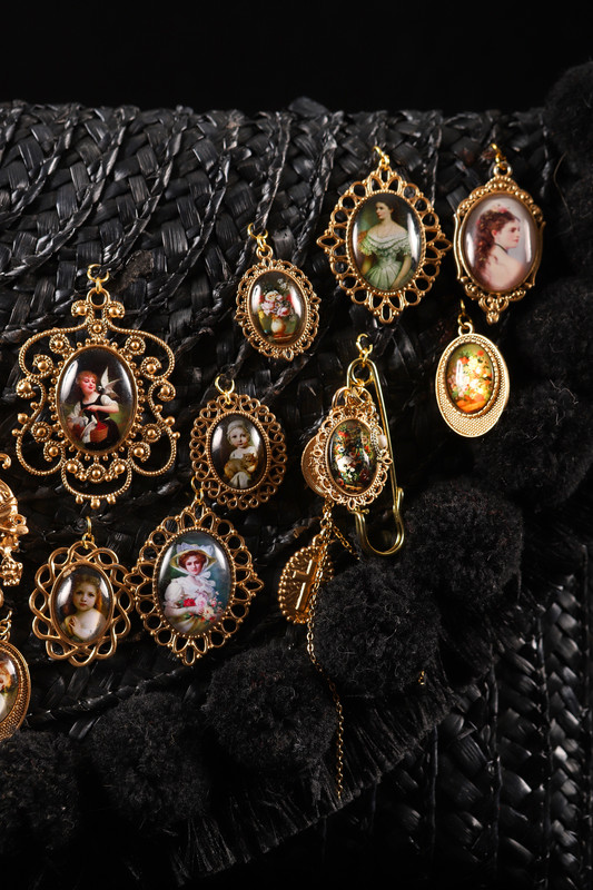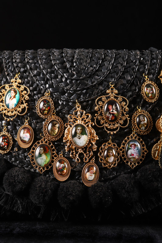 Clutch de paja tejido a mano de color negro, se utiliza de mano o de hombro con cadena metálica dorada, camafeos metálicos con figuras de mujeres y temas florales.