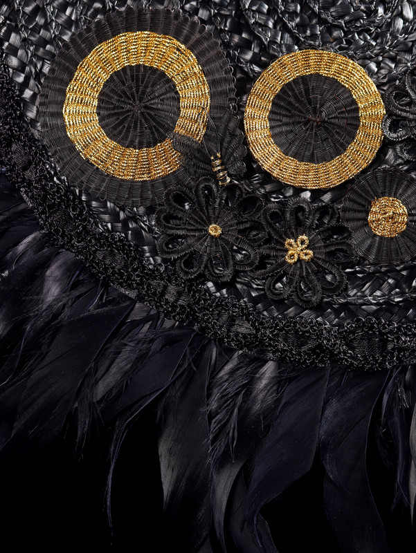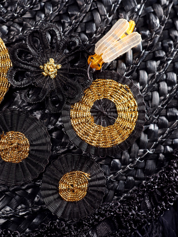Capazo negro de paja tejido a mano, se usa de mano y hombro, cadena metálica dorada, círculos negros con hilo dorado de crin, flores negras con hilo de seda.